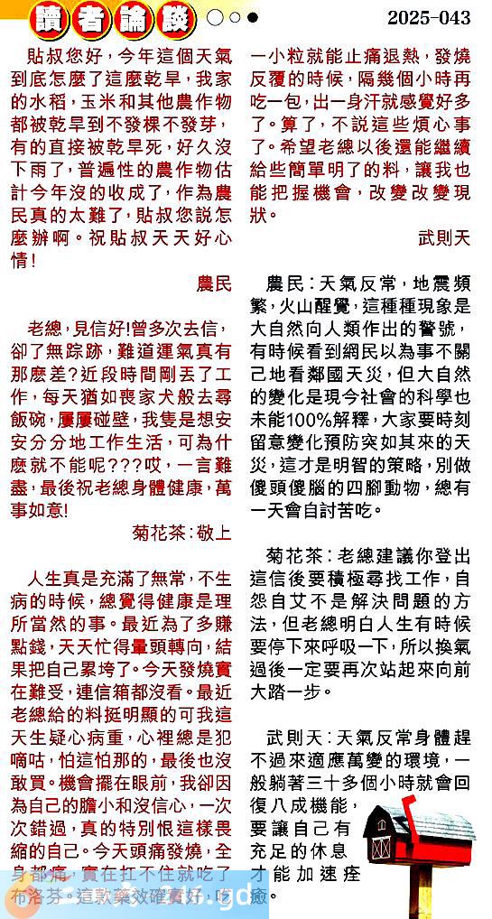 3.人生真是充滿了無常,不生病的時候,總覺得健康是理所當然的事。最近為了多賺點錢,天天忙得暈頭轉向,結果把自己累垮了。今天發燒實在難受,連信箱都沒看。最近老總給的料挺明顯的可我這天生疑心病重,心裡總是犯嘀咕,怕這怕那的,最後也沒敢買。機會擺在眼前,我卻因為自己的膽小和沒信心,一次次錯過,真的特別恨這樣畏縮的自己。今天頭痛發燒,全身都痛,實在扛不住就吃了布洛芬。這款藥效確實好,吃一小粒就能止痛退熱,發燒反覆的時候,隔幾個小時再吃一包,出一身汗就感覺好多了。算了,不說這些煩心事了。希望老總以後還能繼續給些簡單明了的料,讓我也能把握機會,改變改變現狀。武則天