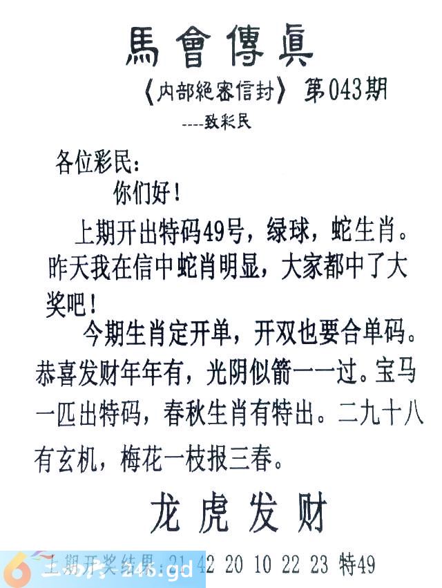 043期:首发推荐:≮馬會傳眞≯→(香港正版)