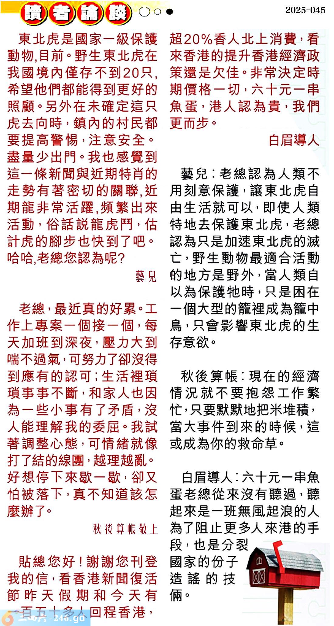 3.貼總您好!謝謝您刊登我的信,看香港新聞復活節昨天假期和今天有一百五十多人回程香港,超20%香人北上消费,看來香港的提升香港經濟政策還是欠佳。非常決定時期價格一切,六十元一串魚蛋,港人認為貴,我們更而步。白眉導人