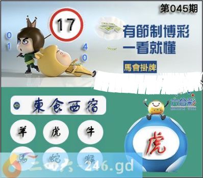045期正版彩图挂:17爆:虎挂牌成语:东食西宿挂牌出肖:羊虎牛马蛇猴正版数码挂牌:24射:3103壹句真言:独步明时负权势(12369)四柱《敲锣打鼓万民乐》开奖时间:04月24日(星期四.猪冲蛇)21:30分搅珠!