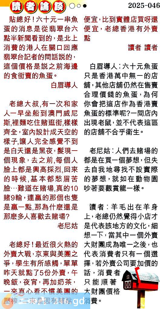 1.貼總好!六十元一串魚蛋的消息是從翡翠台六點半新聞看到的,是北上消費的港人在關口回應翡翠台記者的問話說的,這個價格是說之前海邊的食街賣的魚蛋。白眉導人