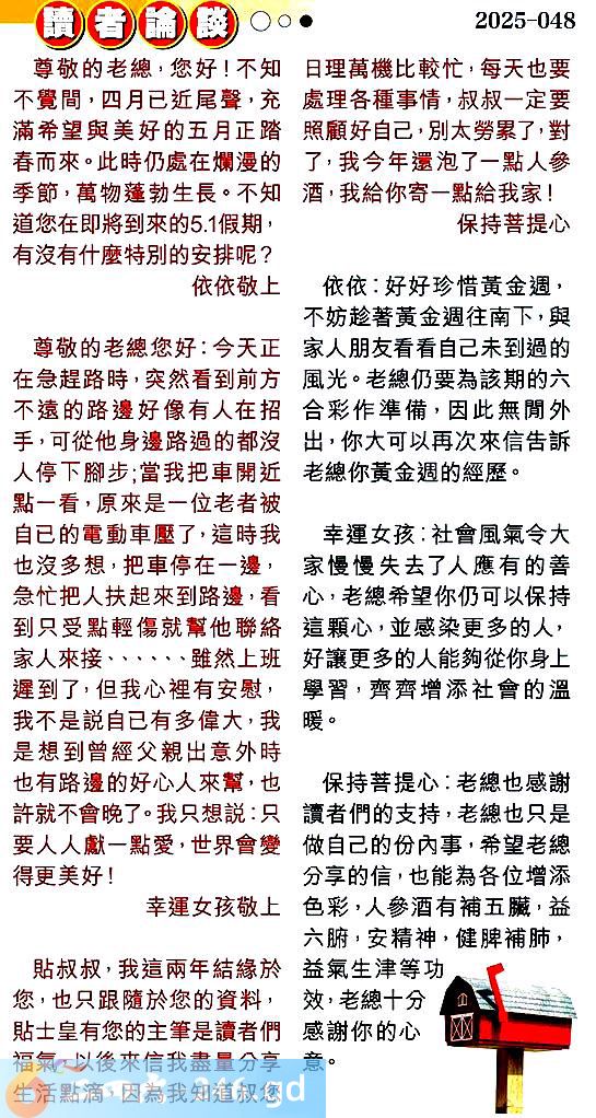 3.貼叔叔,我這兩年結緣於您,也只跟隨於您的資料,貼士皇有您的主筆是讀者們福氣,以後來信我盡量分享生活點滴,因為我知道叔您日理萬機比較忙,每天也要處理各種事情,叔叔一定要照顧好自己,別太勞累了,對了,我今年還泡了一點人參酒,我給你寄一點給我家!保持菩提心