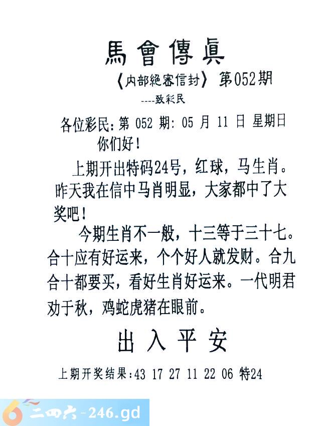 052期:首发推荐:≮馬會傳眞≯→(香港正版)