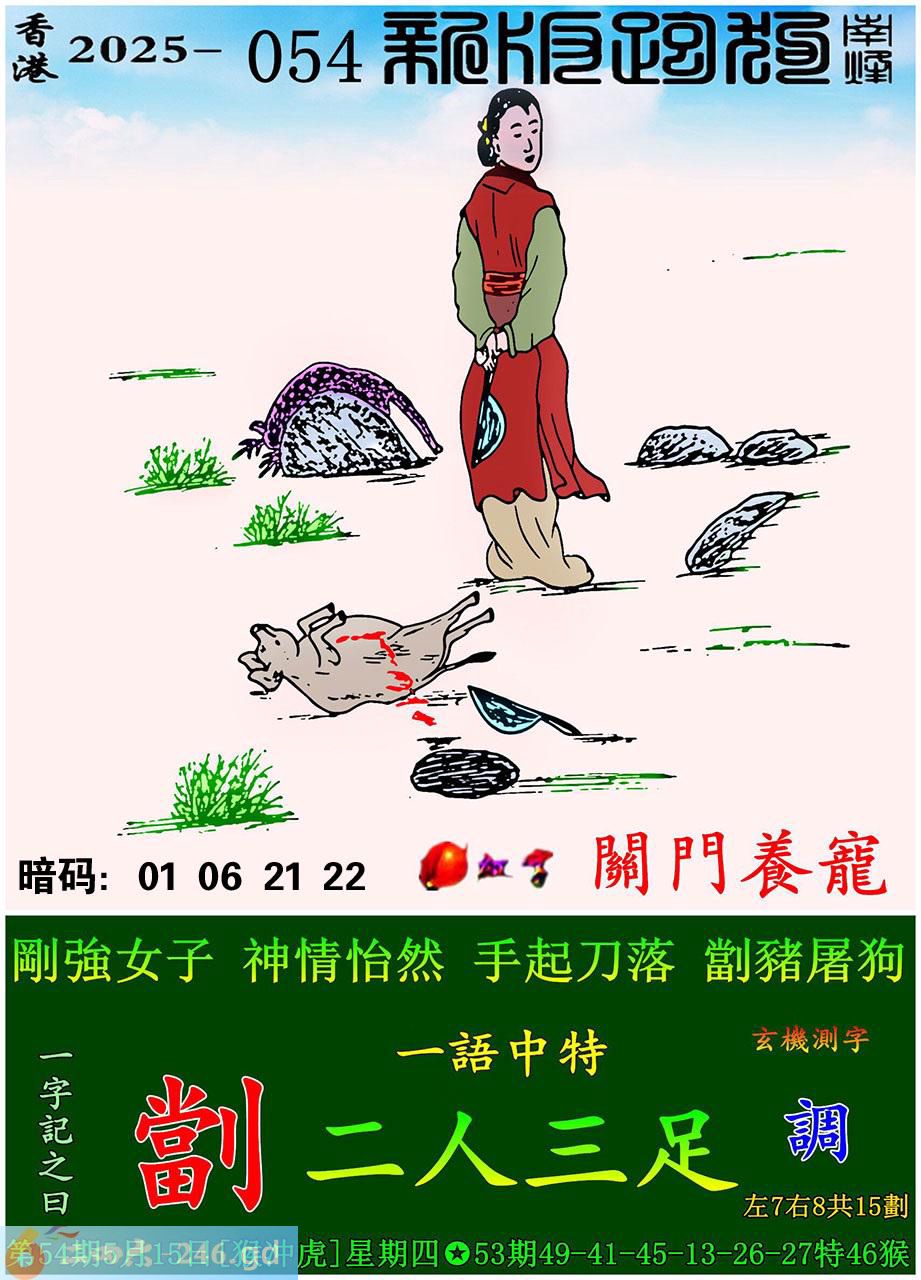054期跑狗一字記之曰:【劏】 剛強女子,神情怡然。 手起刀落。劏豬屠狗。