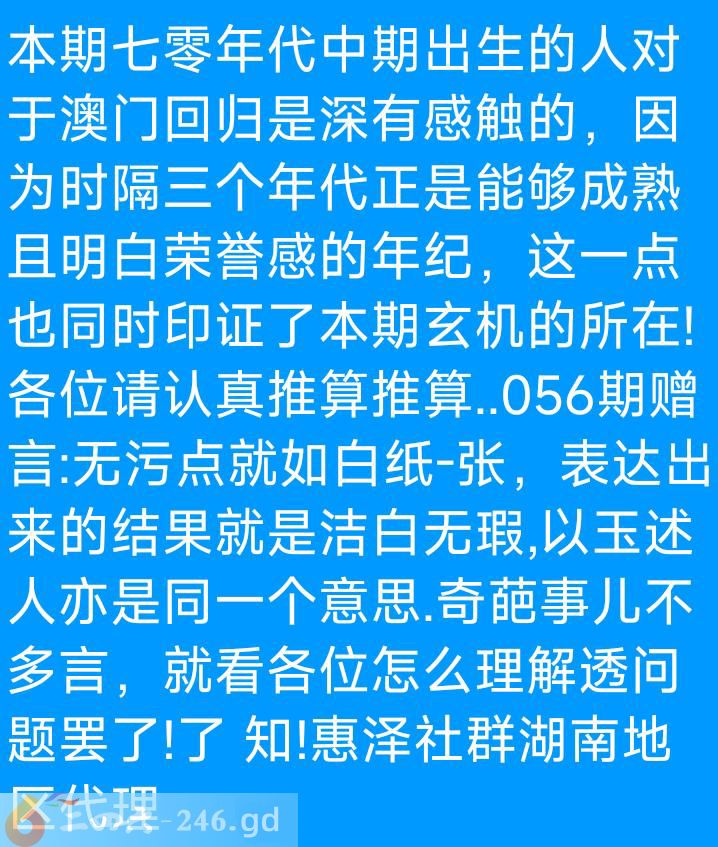 本期七零年代中期出生的人对于澳门回归是深有感触的,因为时隔三个年代正是能够成熟且明白荣誉感的年纪,这一点也同时印证了本期玄机的所在!各位请认真推算推算..056期赠言:无污点就如白纸-张,表达出来的结果就是洁白无瑕,以玉述人亦是同一个意思.奇葩事儿不多言,就看各位怎么理解透问题罢了!了知!惠泽社群湖南地区代理