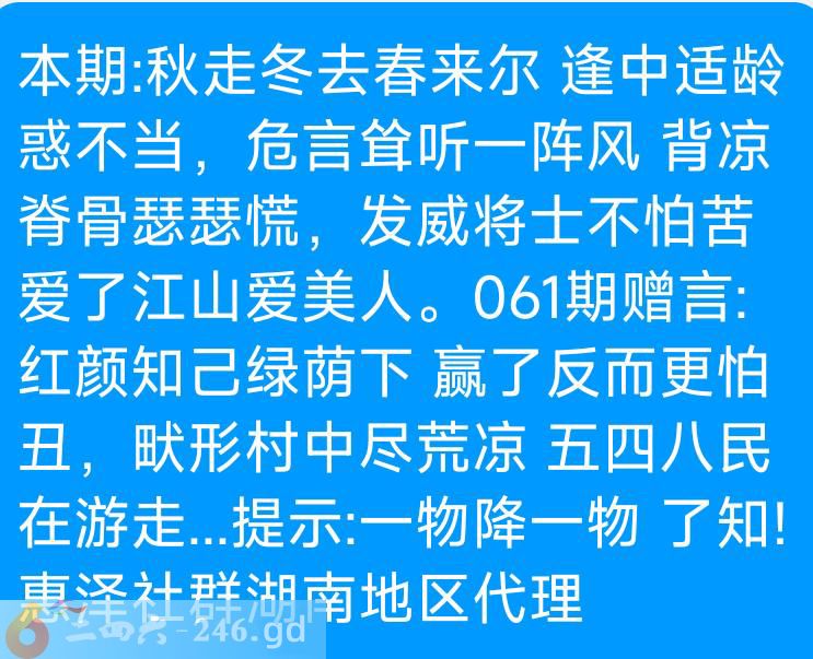 本期:秋走冬去春来尔逢中适龄惑不当,危言耸听一阵风背凉脊骨瑟瑟慌,发威将士不怕苦爱了江山爱美人。061期赠言:红颜知己绿荫下赢了反而更怕丑,畎形村中尽荒凉五四八民在游走...提示:一物降一物了知!惠泽社群湖南地区代理