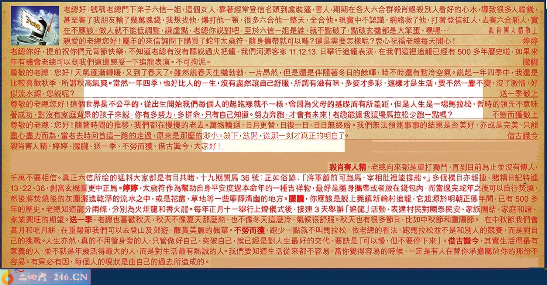 〖殺肖害人精〗:老總向來都是單打獨鬥,直到目前為止並沒有傳人,千萬不要相信。真正六信所給的猛料大家都是有目共睹,十九期開馬36號;正如俗諺:「將軍額前可跑馬,宰相肚裡能撐船。」多個欄目亦報捷,賭精日記特連13、22、36,創富玄機圖更中正馬。