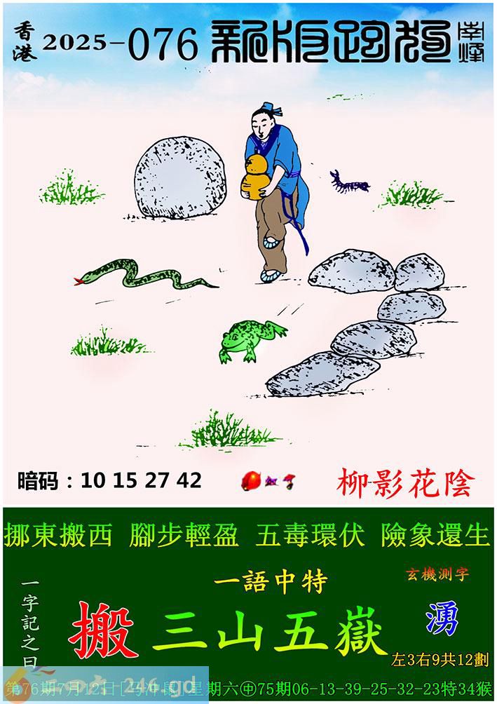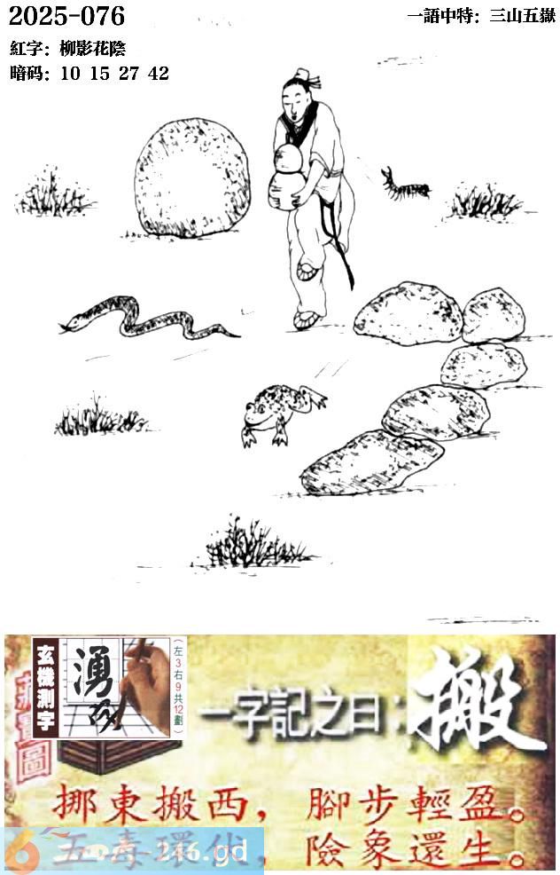 076期跑狗一字記之曰:【搬】 挪東搬西,腳步輕盈。 五毒環伏,險象還生。