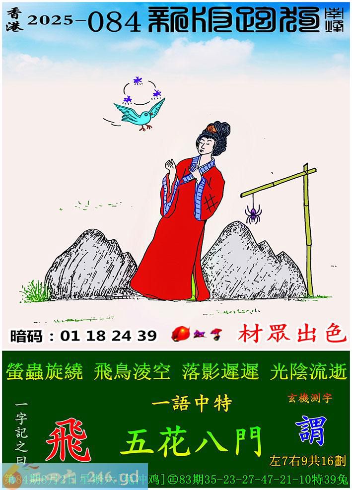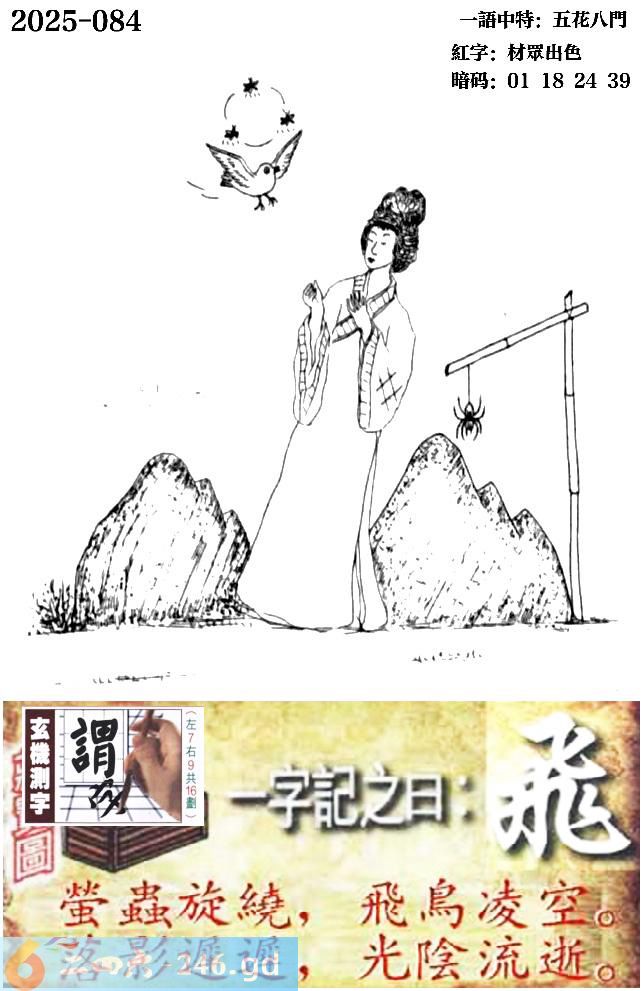 084期跑狗一字記之曰:【飛】 螢蟲旋繞,飛鳥淩空。 落影遲遲,光陰流逝。