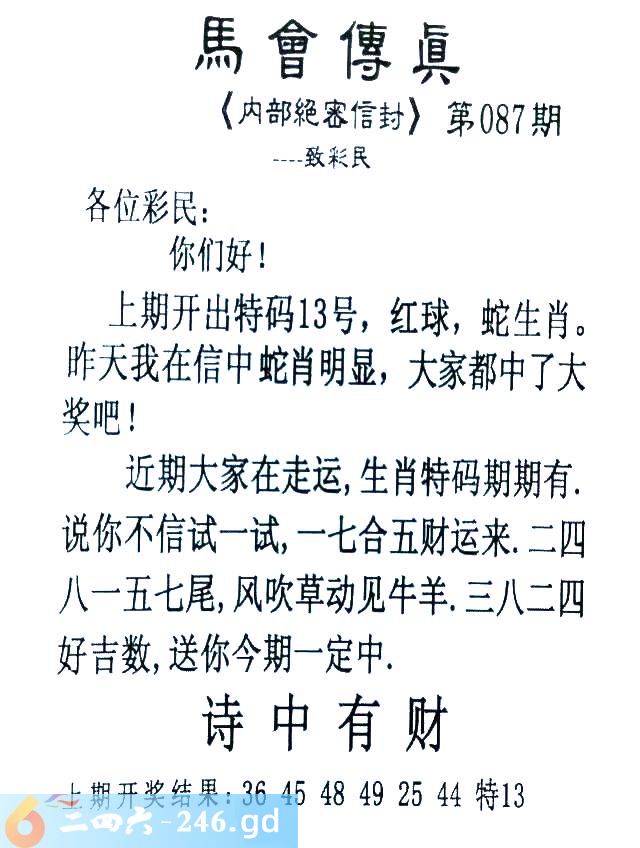 087期:首发推荐:≮馬會傳眞≯→(香港正版)