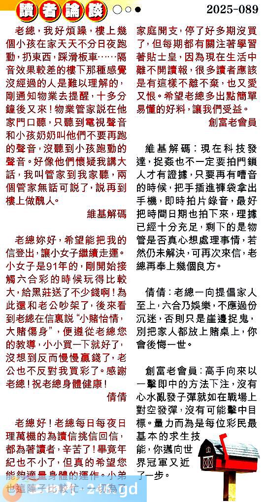 3.老總好!老總每日每夜日理萬機的為讀信挑信回信,都為著讀者,辛苦了!畢竟年紀也不小了,但真的希望您能夠適量身體的運作。小弟也這陣子比較忙,一切為了家庭開支,停了好多期沒買了,但每期都有關注著學習著貼士皇,因為現在生活中離不開讀報,很多讀者應該是有這樣不離不棄,也又愛又恨。希望老總多出點簡單易懂的好料,讓我們受益。創富老會員