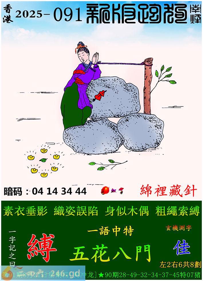 091期跑狗一字記之曰:【縛】 素衣垂影,織姿誤陷。 身似木偶,粗繩索縛。