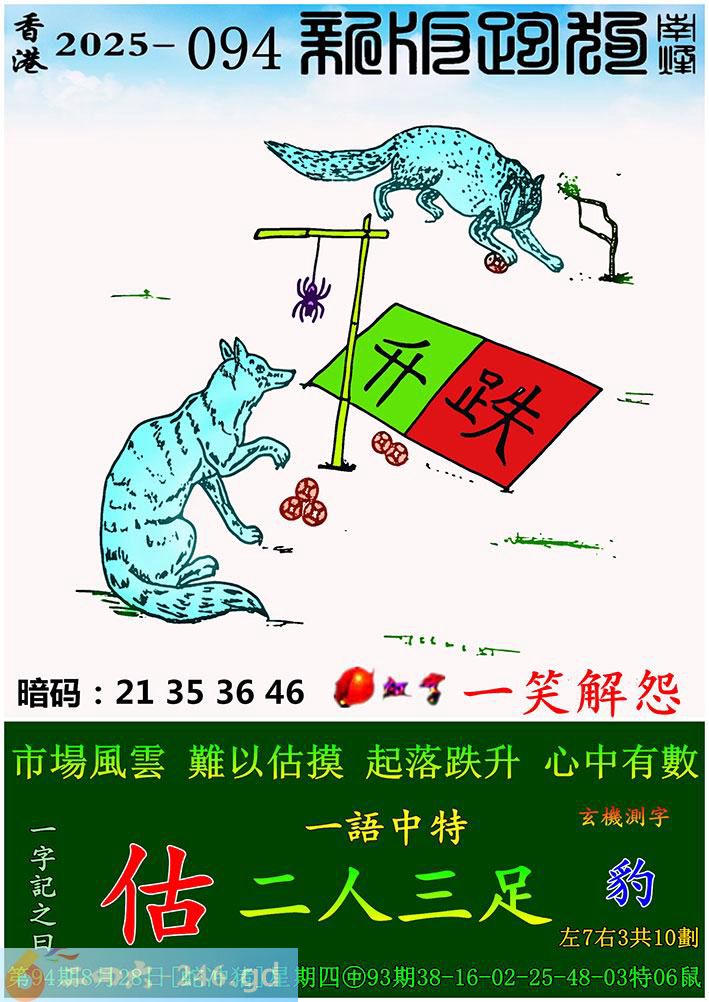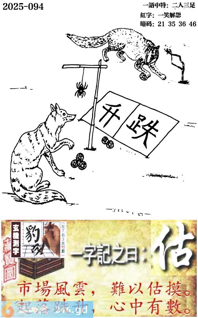 094期跑狗一字記之曰:【估】 市場風雲,難以估摸。 起落跌升,心中有數。