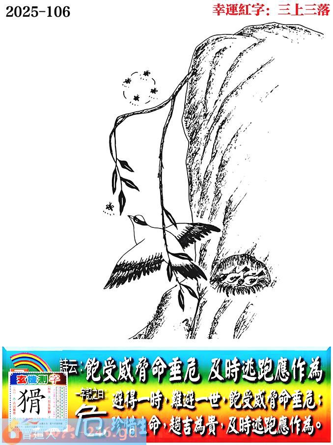 106期老版跑狗一字記之曰:【危】 詩雲:飽受威脅命垂危,及時逃跑應作為。