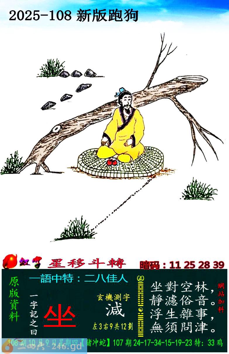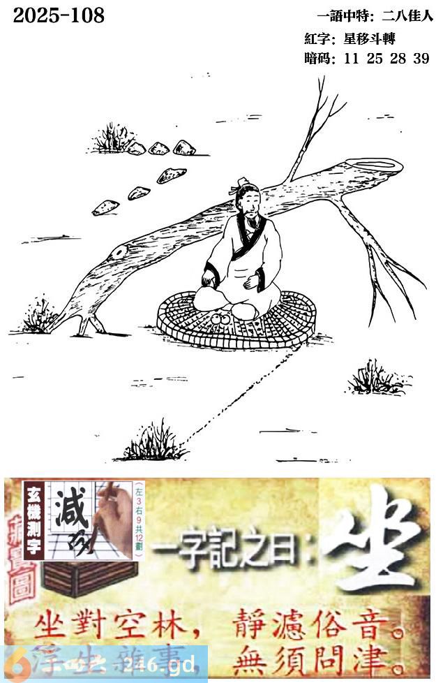 108期跑狗一字記之曰:【坐】 坐對空林,靜濾俗音。 浮生雜事,無須問津。