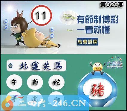 029期开奖时间2024年03月16日(星期日)晚9:30开(农历二月十七猴冲虎) 生肖属性:甲申日;五行属性:水;地支六冲:猴冲虎,无兔;六合:蛇;三合:鼠龙。空亡肖:兔鸡。 六合不出:鼠蛇狗;三合不出:猪马兔;应开生肖:虎猪鸡龙兔。防:牛蛇。 开奖日必开生肖猴日:龙兔羊蛇鼠虎 开奖日日柱对应五行甲申日:土水木 开奖日必开生肖甲申:马鼠狗鸡虎蛇 上期蛇,本期必开:羊鸡虎龙鼠牛狗 《029期》《《香港掛牌之全篇》》 029期正版彩图挂:11爆:猪挂牌成语:北叟失马挂牌出肖:牛鸡蛇羊虎狗 [释义]比喻祸福没有一定。 029期另版香港马会挂牌:20虎 029期马会挂牌290517 029期正版数码挂牌:09射:2611壹句真言:青腰四女扫朱宫(24789) 029期蓝天玄挂牌:42兔 029期四柱《四阶绵绵被纤草》 029期藏寶圖新:阴寒已过勒花天老:家泉石眼两叁茎禁:狗禁:4尾玄機字:《曲》 029期跑狗:【令】令旗飄舉,高高在上。目中無人,倒反天罡。玄機測字:《膫》 029期香港关门联:四肢有力行千里,羊马猪鸡是特码。解[里][6184] 029期香港开门联:八路奇兵三对出,本期要钱看蓝红。解[兵][2576] 029期另香港关门联:五狱寻仙不辞远,两虎竟争分高低解[镜][12783] 029期另香港开门联:搭配三四回头路,一六流水九成尘解[作][54609] 029期内部万花来料:万花开在二八昭华体适宜,蓝红色彩尽显马藏龙居 029期台湾玄门挂牌:[天生一对][341] 029期挂历诗:生来水中是大王,敢于上天告猴王。 029期火车头:烧伤兔。诗:虎死牛伤,一蛇延愿十里长。 029期火烧图解:火烧“狗”。诗:八节奇花四进果,金龙稳锯玉虎安。 029期无字天书:生克之间问生死,何人有情定发家。龙28 029期最老版无字天书:富甲一方朝四野,穷则思变难发芽。牛23 029期九宫禁肖:龙 029期必中人物:杨恭仁 029期二字经:药店 029期六合信箱紅字:無獨有偶暗码:03234246 029期一語中特:二人三足 029期挂牌绝杀料/挂牌绝杀:马 029期正版黄大仙射箭图:12射0427 029期另版黄大仙射箭图:23射3541 029期香港牌:[五体投地]105] 029期内部运程曰:星辰北斗。配密码:{345} 029期香港信封挂牌:算世上久无公是非(亥时上下)加1578 029期波段预测:10----2735--49 029期特码大小单双句:四阶绵绵被纤草解?? 029期特码大小单双句:七宝瑶台千岁石解?? 029期铁算盘:七九单个不(古人学道三千春)开:? 029期香港版《香港六合天书挂牌》天书:牛到本期出特码,羊的胆子算最小。天码:41、13、45、24、37、43、48 029期(香港版)六合对联诗:横联:七九相合上联:二三后来一灵码下联:一五中特三九开解:三。密码:67801 029期正版马会大门口挂牌一句话:本期二归三一从头起【挂39送46】 029期另类马会大门口挂牌一句话:猪鸡牛狗等郎归【马会送07】 029期香港生活开门联:佳人等待好合数,二七加三好码来解[七][48736] 029期香港生活关门联:二五来到三七数,七八月间花儿开解[八][42716]