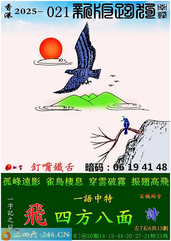 021期跑狗一字記之曰:【飛】 孤峰遠影,雀鳥棲息。 穿雲破霧,振翅高飛。