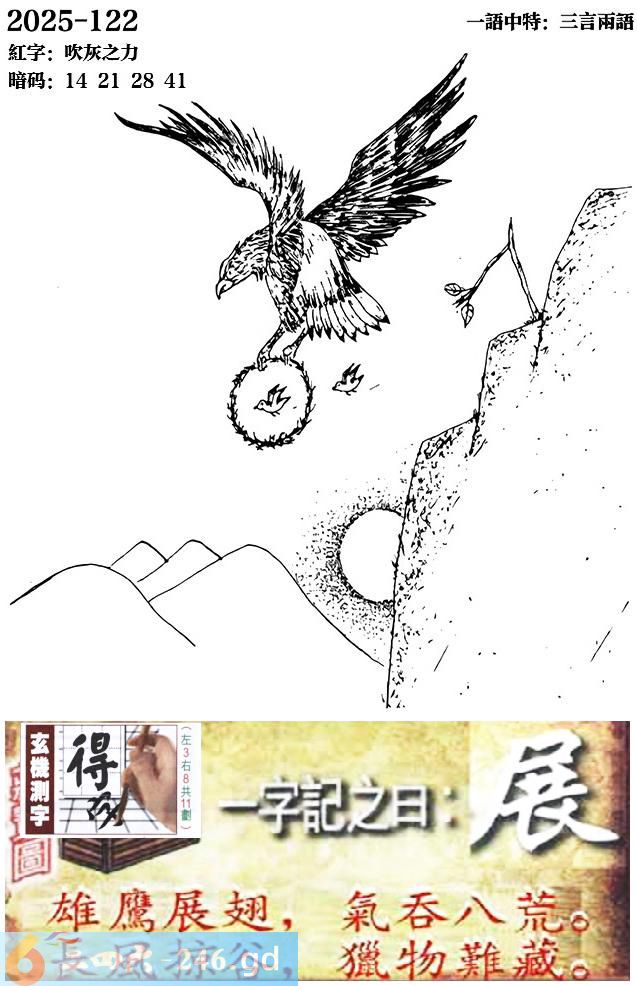 122期跑狗一字記之曰:【展】 雄鷹展翅,氣吞八荒。 長風掠谷,獵物難藏。