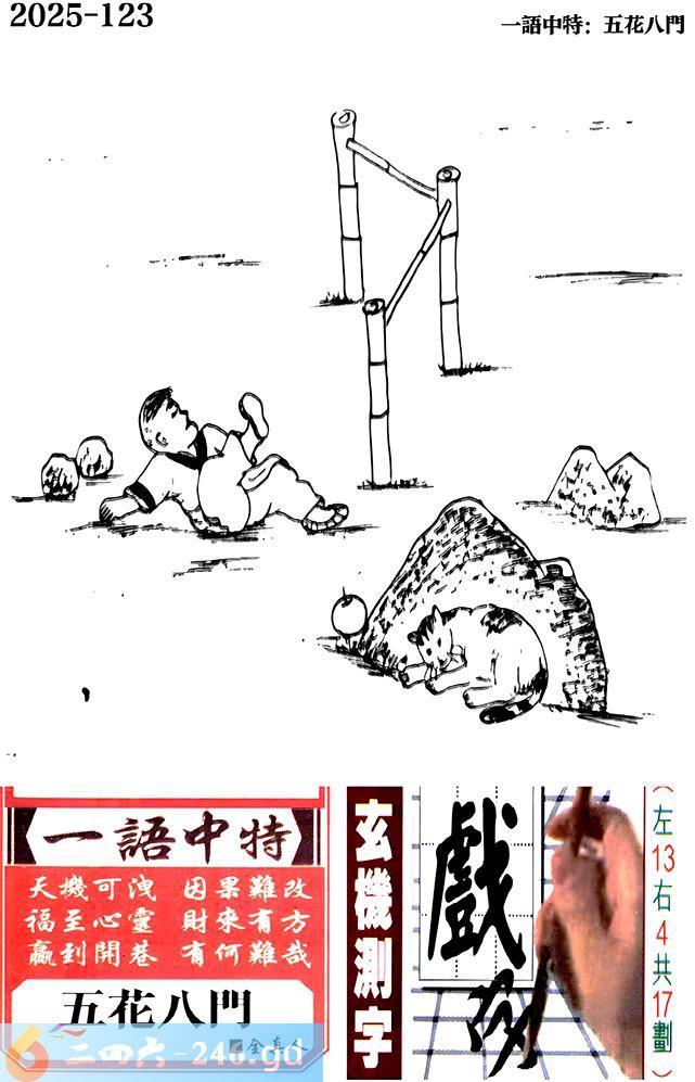 123期跑狗一字記之曰:【躲】 屏氣凝神,躲於石陰。 聞聲不語,笑等追尋。