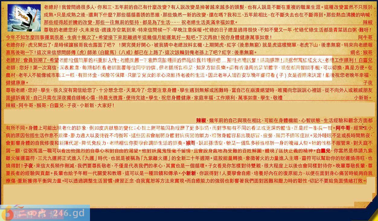 第127期《六合皇信箱文字版》10000%正確!!!正版二四六論壇*精心製作!!! 辣椒、阿牛哥、猴哥、白靈兒、子夜、小新新,大家好! 【1】.老總好!我曾問過很多人,你和三、五年前的自己有什麼改變?有人說改變是掉著越來越多的頭髪,也有人說是不斷在重複的職業生涯。這種改變當然不只限於成熟。只是成熟之後,還剩下什麼?那些循循善誘的思維,那些焕然一新的改變,還在嗎?我和三、五年前相比,在不斷失去也在不斷得到。那些熱血沸騰的呐喊,那些經得起折騰的改變那些二往無前的堅持,都是為了生活......祝老總生活美滿幸福如意。辣椒 〖辣椒〗:幾年前的自己與現在相比,可能在身體機能、心智狀態、生活經驗和觀念方面都有所不同。身體上可能出現老化的跡象,例如皮膚狀態的變化;心智上則可能因為經歷了更多事情,而對事物有不同的看法或更深的體悟,正是經一事長一智。 【2】.尊敬的老總您好,久未來信,適逢冷空氣到來,特來信問候一下,早晚注意保暖。忙碌的日子總是過得很快,不知不覺又一年,忙碌忙碌生活都是青菜送白粥,難呀!今年不知怎麼回事運氣很差,生病十幾次了。希望接下來距離過年這幾個月能運氣好點吧。下次再敘!祝你身體健康萬事如意!阿牛哥 〖阿牛哥〗:經常生小病的原因包括生活作息不規律、壓力過大以及營養不均衡等,這些因素會削弱身體對抗病菌的能力,導致身體容易出現感冒、疲勞、腸胃不適等症狀。另外睡眠不足或長時間熬夜,會影響身體的自我修復和新陳代謝,降低免疫力,老總相信你要學會調節生活的節奏。 【3】.老總你好,虎兄開出了,是時候讓猴哥我也露面了吧?!開完獎好開心,被我猜中老總放料玄機,上期開虎,紅字《後患無窮》就是虎這樣簡單,老虎下山,後患無窮特來向老總報喜馬後饱一下!這次來信想問師傅(虎)師弟(白龍馬)(八戒)都已在上路了,這次該輪到俺老孫上了吧?紅字:後患無窮。網名:猴哥 〖猴哥〗:說起孫悟空,他是一個集多種性格於一身的複雜人物。他的性格不服管束,對天庭不屑一顧,從弼馬一職可以看出他強烈的自尊心和對自由的渴望。他對妖魔鬼怪毫不留情,且會設身處地為受難的百姓解圍,體現了匡扶正義的精神。 【4】.老總好:會員到期了,希望老總給個簡單的料重新入會,老總推薦一下紫饰店能事運的飾品給我轉轉揮吧...期待老總回复!感謝感謝!順祝創富紅紅火火,老總工作順利!白靈兒 〖白靈兒〗:你當然是恭請九紫離火催運靈符,三元九運將正式進入「九運」時代,也就是被稱為「九紫離火運」的全新二十年週期。這股能量轉換,象徵著火的力量進入主導,靈符可以幫助你的財運燒得旺,也燒得對! 【5】.老師:您好!第一次寫信,深表歉意,每期都在看老師回覆每位同學的信、但老師所言極是,知足方能長樂。還有香港用的是繁體字,現在都用智能手機,可以切换真是方便。在農村,老年人不能像城市職工樣,有退休金、保險等保障,只能靠兒女的孝心來維持老後的生活。因此老年人能否安享晚年還得看(子)女是否順來決定!最後祝您老晚年幸福,健健康康。子夜 〖子夜〗:來信太長稍作刪減,我們要尊長敬老,不僅是代表我們的孝心,其實也是一個循環。子女看見你怎樣對待雙親,很大程度上以後也會同樣對待你。晚輩尊敬長輩,尊重長者的經驗與貢獻。長輩也給予年輕一代關愛和教導,這可以是一種回饋和傳承。 【6】.尊敬老總,您好,學生,很久沒有寫信給您了,十分想念您,天氣冷了,您要注意身體,學生遇到無解或困難時,當自己在崩潰絕望時,唯獨向您說說心裡話,從不向外人或親戚朋友面傾訴痛苦,自己只需在深夜獨自缝補心傷,待晨光微露,便待完途。學生,祝您身體健康,家庭幸福,工作順利,萬事如意,學生,敬禮小新新。 〖小新新〗:你說得對!人要學會自癒,培養好內在的復原能力,以便在面對身心痛苦時能夠自我療傷,重新獲得平衡與力量。可以透過調整生活習慣、練習正念、自我寬恕等方法來實現。而自癒能力的強弱也影響著我們面對困難和壓力時的韌性,切記不要給負面情緒打敗。 紅字:昂首伸眉 暗码:15182142 [释义]形容意气昂扬的样子。 [出处]汉·司马迁《报任少卿书》:“乃欲仰首伸眉,论列是非,不亦轻朝廷,羞当世之士耶!”