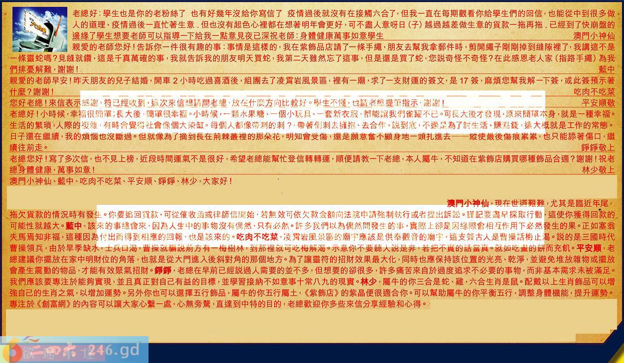 第129期《六合皇信箱文字版》10000%正確!!!正版二四六論壇*精心製作!!! 澳門小神仙、藍中、吃肉不吃菜、平安順、錚錚、林少,大家好! 【1】.老總好:學生也是你的老粉絲了也有好幾年沒給你寫信了疫情過後就沒有在接觸六合了,但我一直在每期觀看你給學生們的回信,也能從中到很多做人的道理、疫情過後一直忙著生意.但也沒有起色心裡都在想著明年會更好,可不盡人意呀日(子)越過越差做生意的貨款一拖再拖.已經到了快崩盤的邊緣了學生想要老師可以指導一下給我一點意見夜已深祝老師:身體健康萬事如意學生澳門小神仙 〖澳門小神仙〗:現在世道艱難,尤其是臨近年尾,拖欠貨款的情況時有發生。你要追回貨款,可從催收函或律師信開始,若無效可依欠款金額向法院申請強制執行或者提出訴訟。謹記要盡早採取行動,這使你獲得回款的可能性就越大。 【2】.親爱的老師您好!告訴你一件很有趣的事:事情是這樣的,我在紫飾品店請了一條手繩,朋友去幫我拿郵件時,剪開繩子剛剛掉到縫隙裡了,我講這不是條靈蛇嗎?見縫就鑽,這是千真萬確的事,我就告訴我的朋友明天買蛇,我第二天雖然忘了這事,但是還是買了蛇,您說奇怪不奇怪?在此感恩老人家((指路手繩)為我們排憂解難,謝謝!藍中 〖藍中〗:該來的事總會來,因為人生中的事物沒有偶然,只有必然。許多我們以為偶然間發生的事,實際上卻是因緣際會相互作用下必然發生的果。正如塞翁失馬焉知非福,這種因為付出而得到相應的回報,也是該來的。 【3】.親愛的老師早安!昨天朋友的兒子結婚,開車2小時吃過喜酒後,組團去了凌霄岩風景區,裡有一廟,求了一支財運的簽文,是17簽,麻煩您幫我解下簽,或此簽預示著仕麼?謝謝!吃肉不吃菜 〖吃肉不吃菜〗:凌霄岩風景區的廟宇應該是供奉觀音的廟宇,這支簽古人是曹操話梅止渴。說的是三國時代曹操領兵,由於旱季缺水,士兵口渴,曹操就騙說前方有一梅樹林,到那裡就可吃梅解渴。示意你不要聽人說是非,若把不實的話當真。就如吃畫的餅而充飢。 【4】.您好老總!來信表示感謝,符已經收到,這次來信想請問老總,放在什麼方向比較好。學生不懂,也請老總提筆指示,謝謝!平安順敬 〖平安順〗:老總建議你擺放在家中明財位的角落,也就是從大門進入後斜對角的那個地方。為了讓靈符的招財效果最大化,同時也應保持該位置的光亮、乾淨,並避免堆放雜物或擺放會產生震動的物品,才能有效聚氣招財。 【5】.老總好!小時候,幸福很簡單;長大後,高單很幸福。小時候,一顆水果糖、一個小玩具、一套新衣服,都能讓我們雀躍不已。可長大後才發現,原來簡單本身,就是一種幸福。生活的繁瑣,人際的複雜,有時會覺得社會像個大染缸。每個人都像帶刺的刺?帶蓍倒刺去擁抱去合作,說到底,不過是為了討生活、賺點錢,這大概就是工作的常態。日子還在繼續,我的煩惱也沒斷過。但就像為了摘到長在荊棘叢裡的那朵花,明知會受傷,還是願意奮不顧身地一頭扎進去一一縱使最後傷痕累累,也只能舔著傷口,繼續往前走。錚錚敬上 〖錚錚〗:老總在早前已經說過人需要的並不多,但想要的卻很多,許多痛苦來自於過度追求不必要的事物,而非基本需求未被滿足。我們應該要專注於能夠實現,並且真正對自己有益的目標,並學習接納不如意事十常八九的現實。 【6】.老總您好!寫了多次信,也不見上榜,近段時間運氣不是很好,希望老總能幫忙登信轉轉運,順便請教一下老總,本人屬牛,不知道在紫飾店購買哪種飾品合適?謝謝!祝老總身體健康,萬事如意!林少敬上 〖林少〗:屬牛的你三合是蛇、雞,六合生肖是鼠。配戴以上生肖飾品可以增強自己的生肖之氣,以增加運勢。另外你也可以選擇五行飾品,屬牛的你五行屬土,《紫飾店》的紫晶便很適合你。可以幫助屬牛的你平衡五行,調整身體機能,提升運勢。專注於《創富網》的內容可以讓大家心繫一處,心無旁騖,直達到中特的目的,老總歡迎你多些來信分享經驗和心得。 紅字:欲速不達 暗码:04211048 [释义]想求快速,反而不能达到目的。 [出处]先秦·孔子《论语·子路》:“无欲速,无见小利。欲速则不达,见小利则大事不成。”