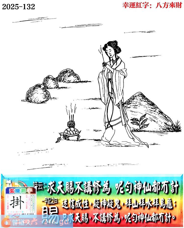 132期老版跑狗一字記之曰:【賜】 詩雲:求天賜不講修為,呢勻神仙都冇計。