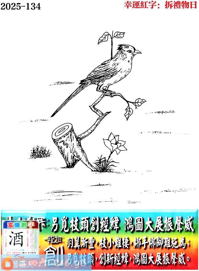 134期老版跑狗一字記之曰:【創】 詩雲:另覓枝頭創經緯,鴻圖大展振聲威。