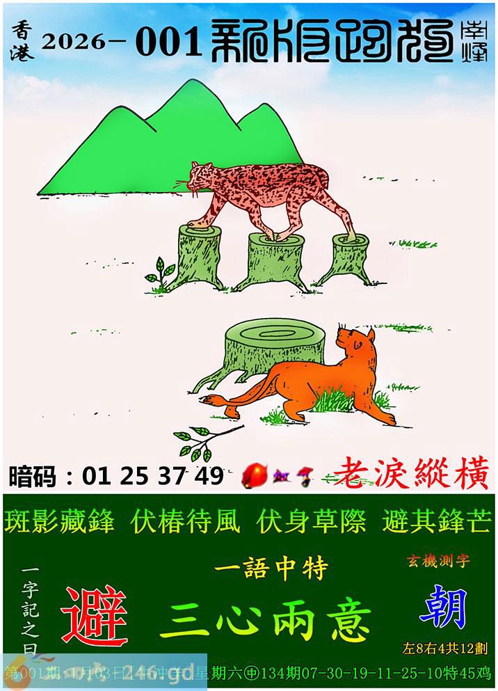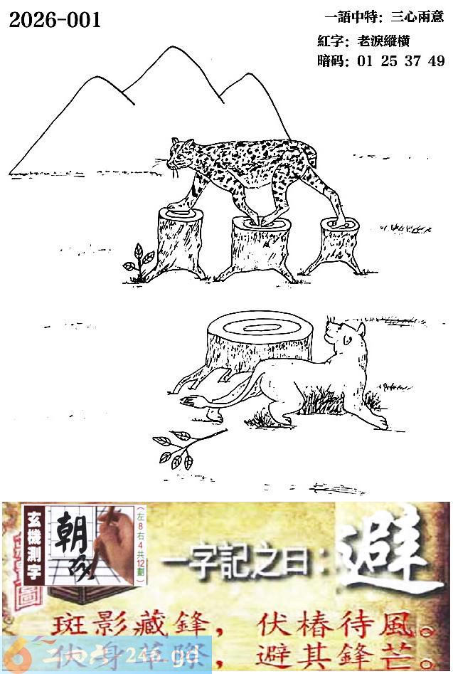 001期跑狗一字記之曰:【避】 斑影藏鋒,伏椿待風。 伏身草際,避其鋒芒。