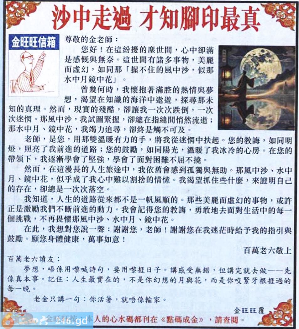 001期:金旺旺信箱彩民推荐→→《沙中走過 才知腳印最真》