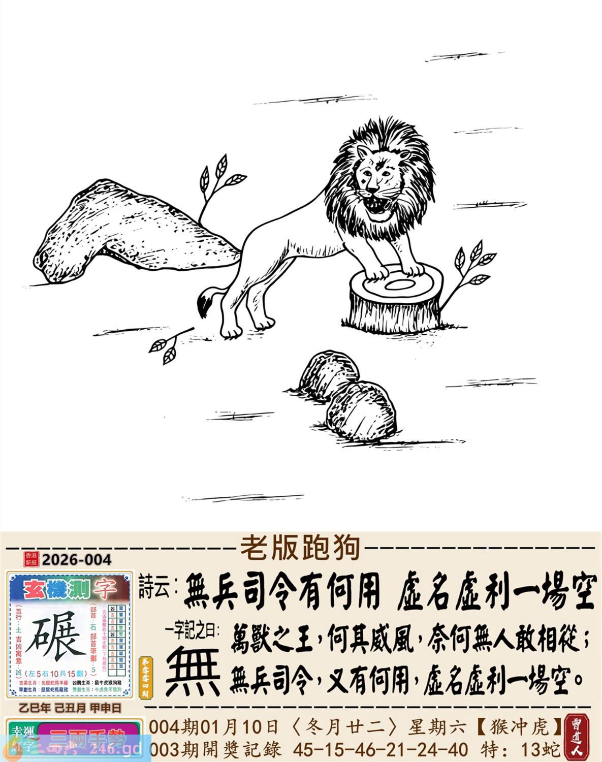 2026年1月10日004期虎(戊寅)(泉中水) 004期:老版跑狗玄機一字記之曰:【無】 詩云:無兵司令有何用虛名虛利一場空 萬獸之王,何其威風,奈何無人敢相從; 無兵司令,又有何用,虛名虛利一場空。 玄機測字:《碾》 密圖詩:一對核桃一對棗 《記》:試看中有玉兔 特碼大小單雙句:伸手要錢 今期必中:黄月英 004期:特碼歇后語 葵花的盘子-----老转向 004期正版四字梅花诗:涉险过关。 004期火车头:烧伤马。诗:羊死龙伤,四书五经读一生。 004期香港第一手欲钱料:一。 004期曾道人说:“人?” 004期另版四字梅花诗:七十二变。 004期香港第一手欲钱料:欲钱找世界最高楼。 004期曾道人说:“为什么现代的人喜欢赌博”? 004期:二字經:帶頭 004期:白头翁是特码 004期:智力金壤:春和景明 004期:信箱紅字:【獨占鰲頭】 004期:【暗碼:01-25-37-49】 004期:一語中特:【二八佳人】 發財玄機圖:伺機而動狡猾敏捷圖中明蛇鼠藍綠 004期:藏寳圖 新:天教谪入群花苑 老:乌蒙磅礴走泥丸 禁:狗禁:1尾玄机字《收》 2026年004期【生活幽默】版 〖精神病院〗 一精神病院裏,院長想看看他的病人到了什程度,就在他們面前放了一祗兔子。 第一個病人上去:"駕!駕!駕!" 第二個病人:"駕,快去追他!"院長無奈地嘆了口氣。 此時,院長看見第三個病人在那一直摸那衹兔子,滿意地點了點頭。没想到那個病人却説: "小樣,先讓你們300米,等我擦完車再説。"