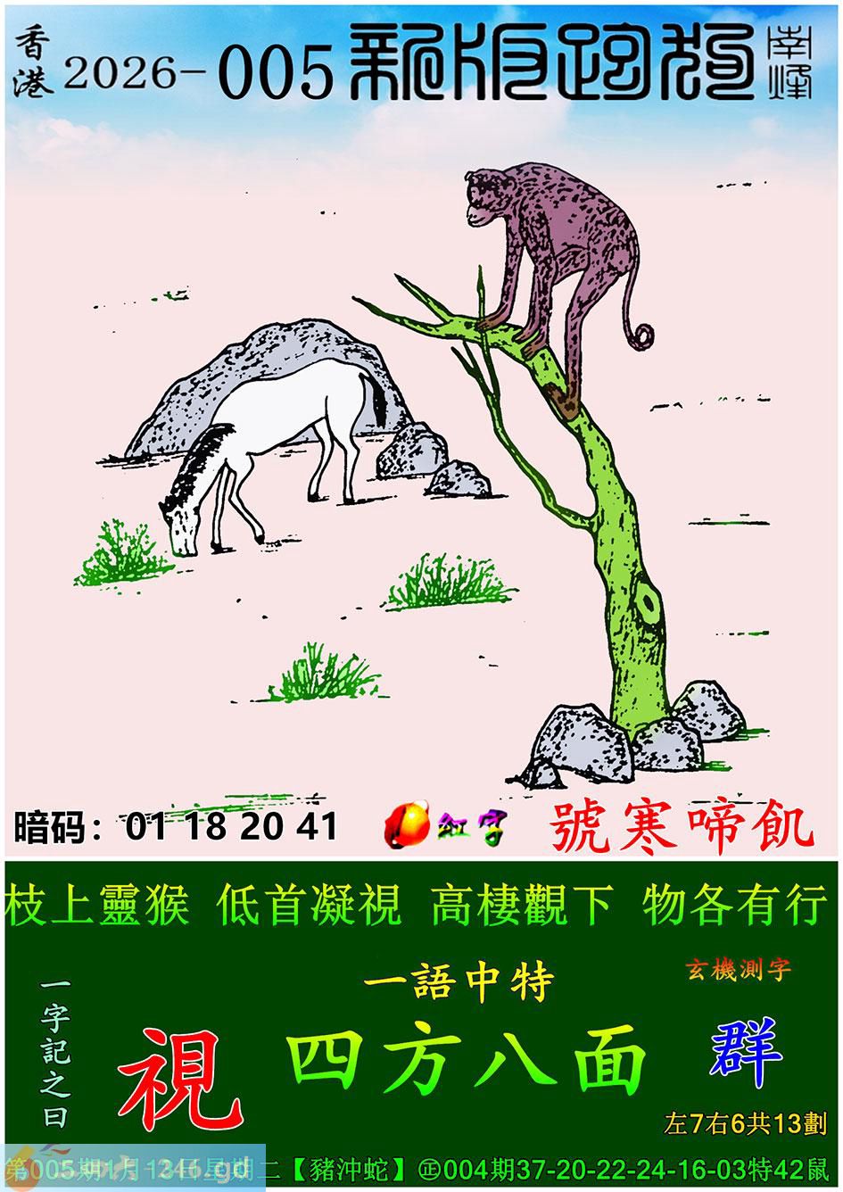 005期跑狗一字記之曰:【視】 枝上靈猴,低首凝視。 高棲觀下,物各有行。