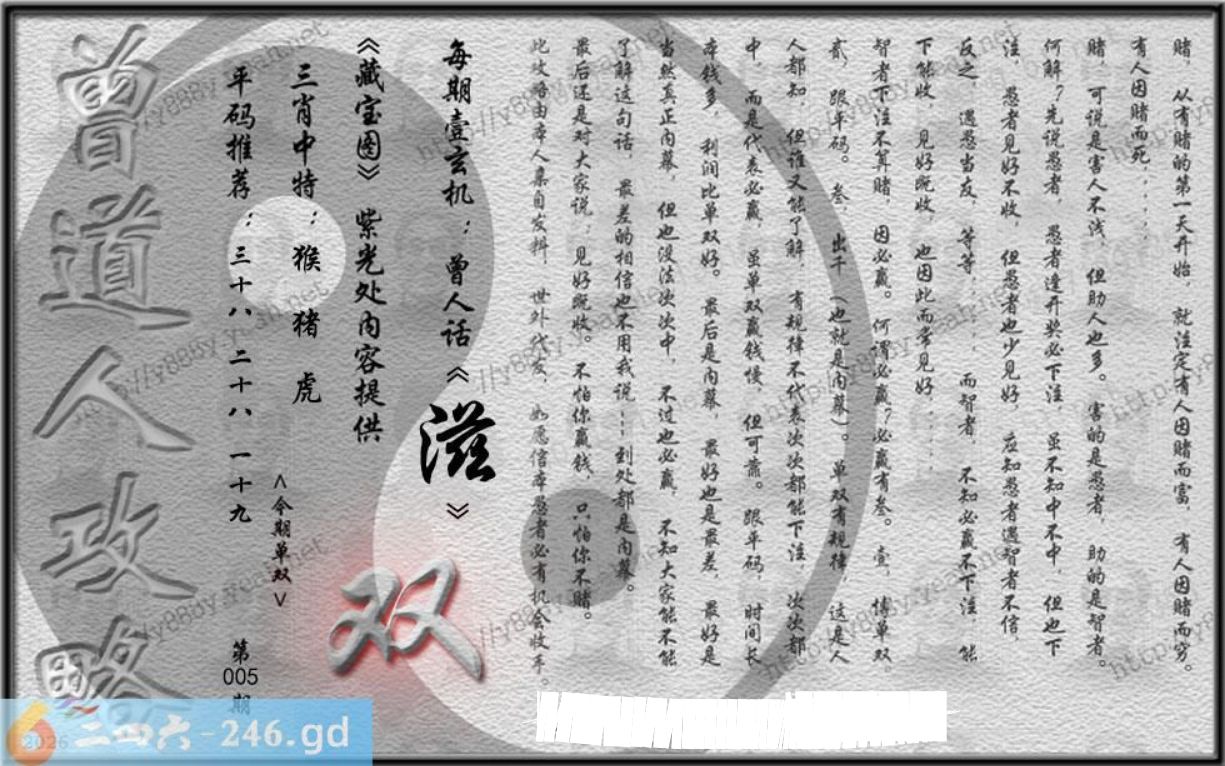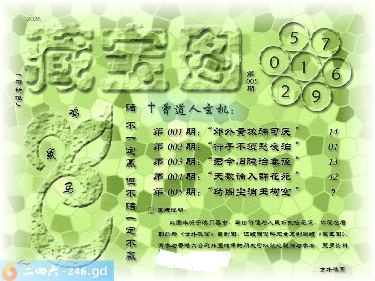 005期藏寶圖 新:倚阁尘消玉树空 老:郑虔自笑穷耽酒 禁:蛇 禁:8尾 玄機字:《滋》