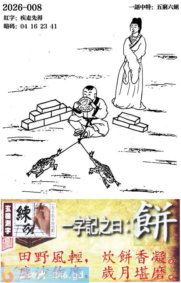 008期跑狗一字記之曰:【餅】 田野風輕,炊餅香凝。 塵沙作席,歲月堪磨。