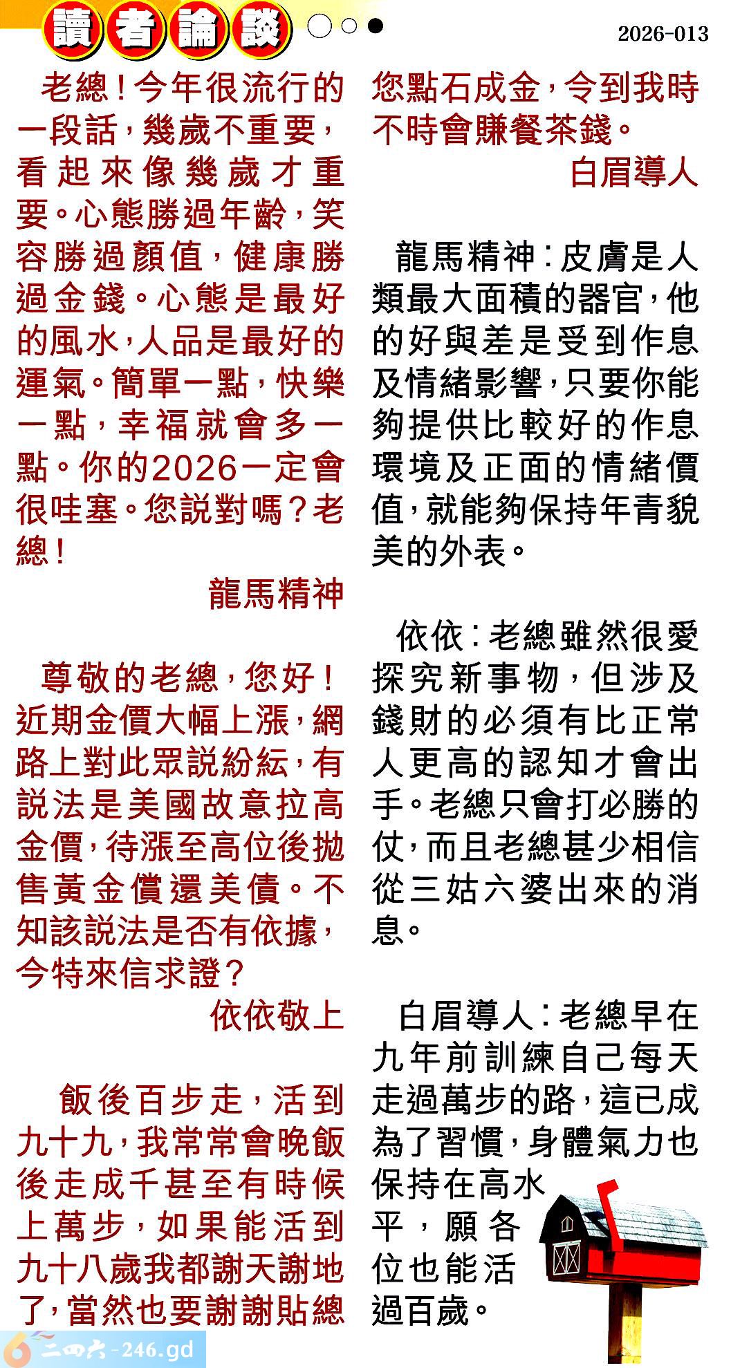 1.老總!今年很流行的一段話,幾歳不重要,看超來像幾歲才重要。心態勝過年齡,笑容勝過顔值,健康勝過金錢。心態是最好的風水,人品是最好的運氣,簡單一點,快樂一點,幸福就會多一點。你的2026一定會很哇塞。您説對嗎?老總!龍馬精神