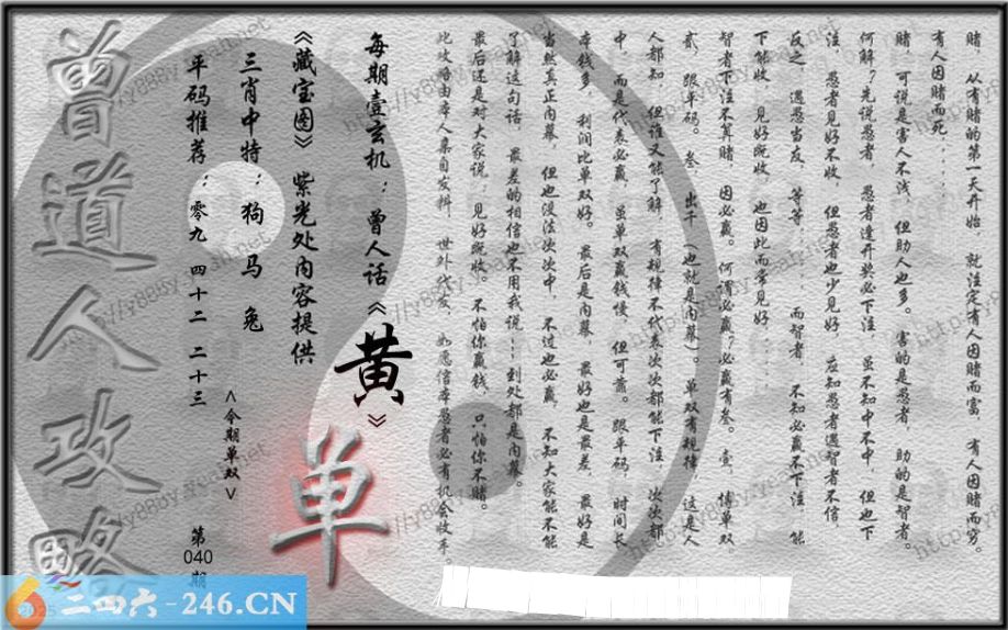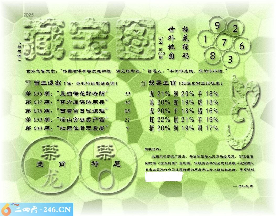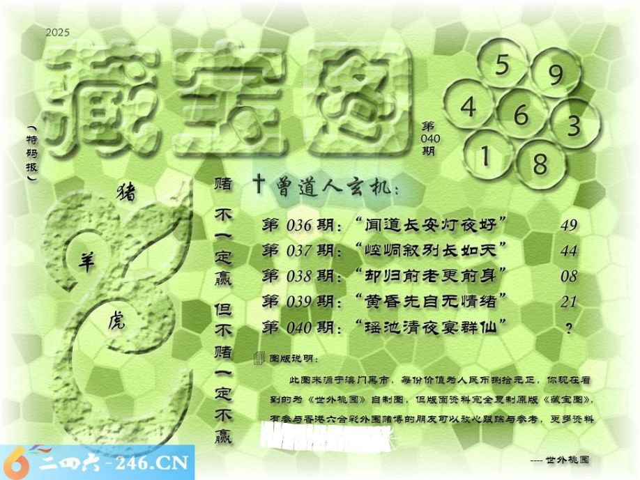 041期藏寶圖 新:瑶池清夜宴群仙 老:知君仙骨无寒暑 禁:龙 禁:0尾 玄機字:《黄》