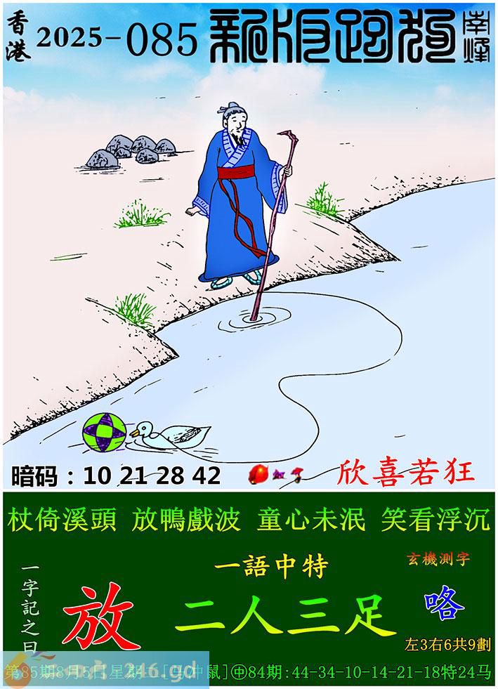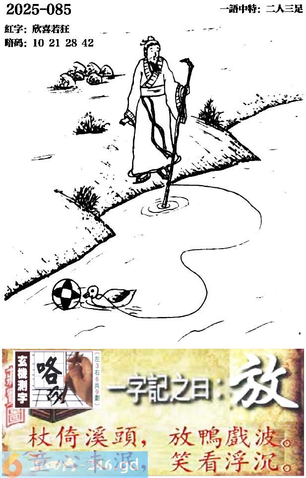 085期跑狗一字記之曰:【放】 杖倚溪頭,放鴨戲波。 童心未泯,笑看浮沈。