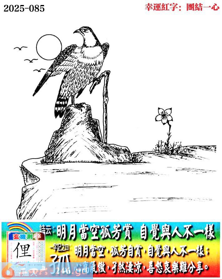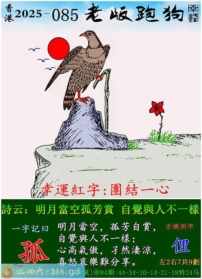 085期老版跑狗一字記之曰:【孤】 詩雲:明月當空孤芳賞,自覺與人不一樣。