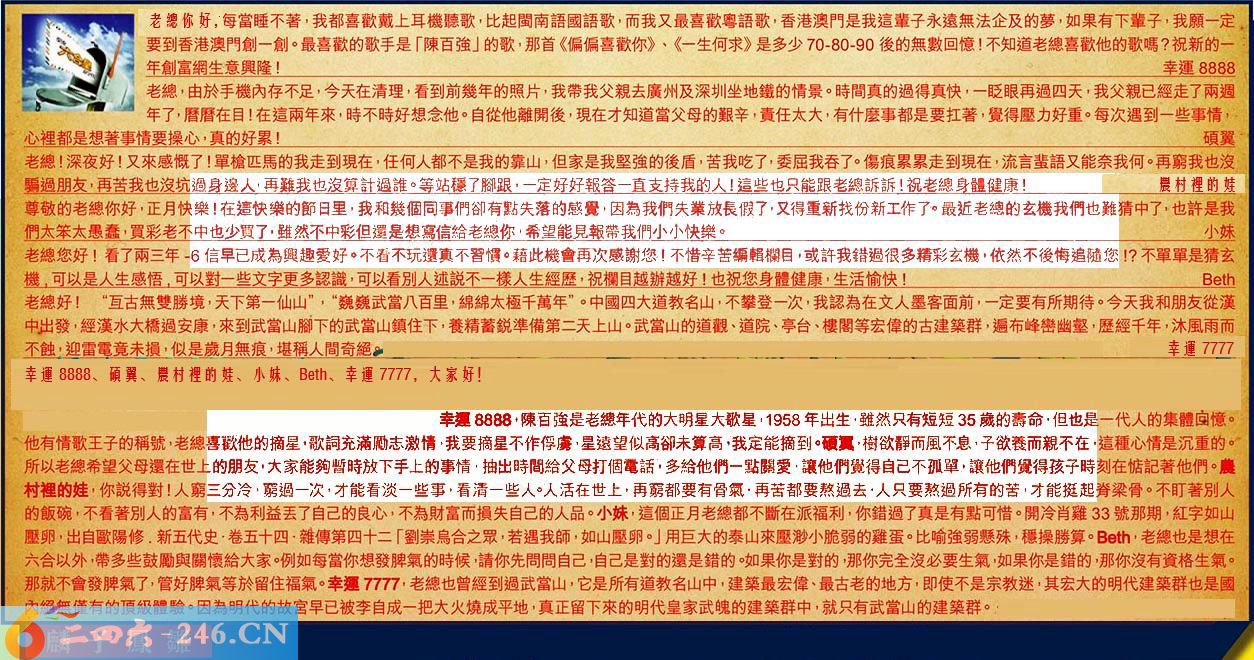 【5】.老總您好!看了兩三年-6信早已成為興趣爱好。不看不玩還真不習惯。藉此機再次感謝您!不惜辛苦編輯欄目,或許我錯過很多精彩玄機,依然不後梅追隨您!?不單單是猜玄機,可以是人生感悟,可以對一些文字更多認識,可以看別人述說不一樣人生經歷,祝欄目越辦越好!也祝您身體健康,生活愉快!