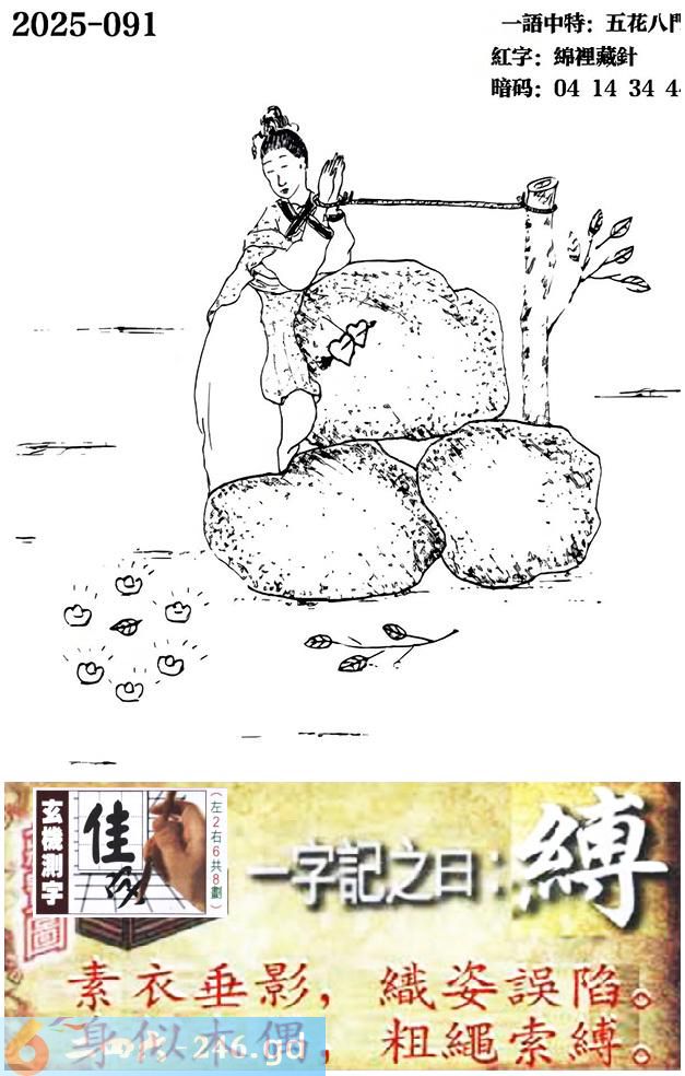 091期跑狗一字記之曰:【縛】 素衣垂影,織姿誤陷。 身似木偶,粗繩索縛。