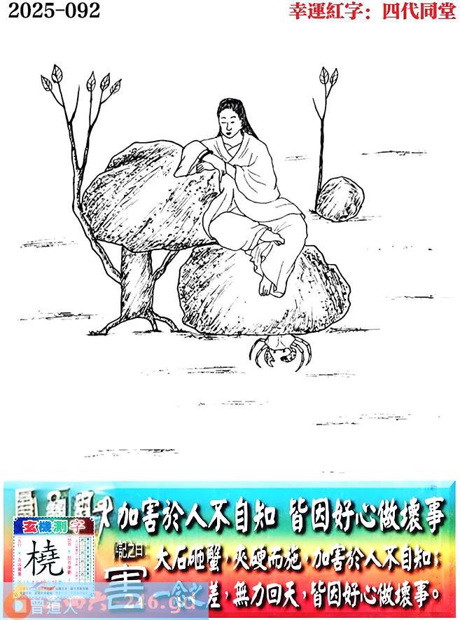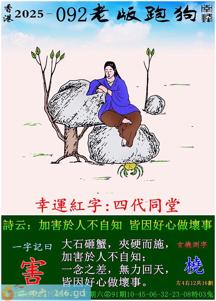 092期老版跑狗一字記之曰:【害】 詩雲:加害於人不自知,皆因好心做壞事。