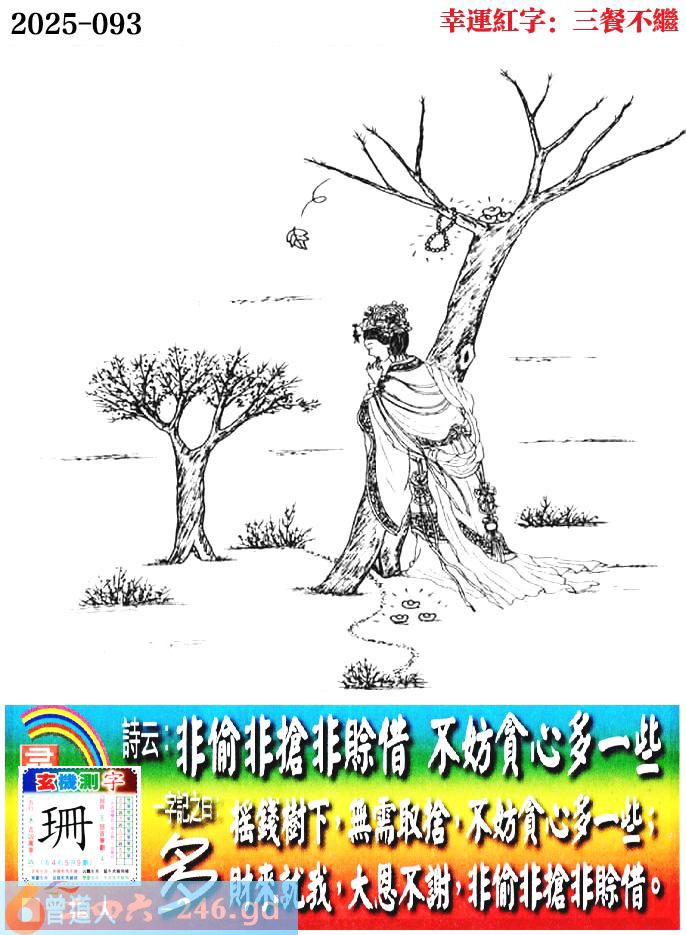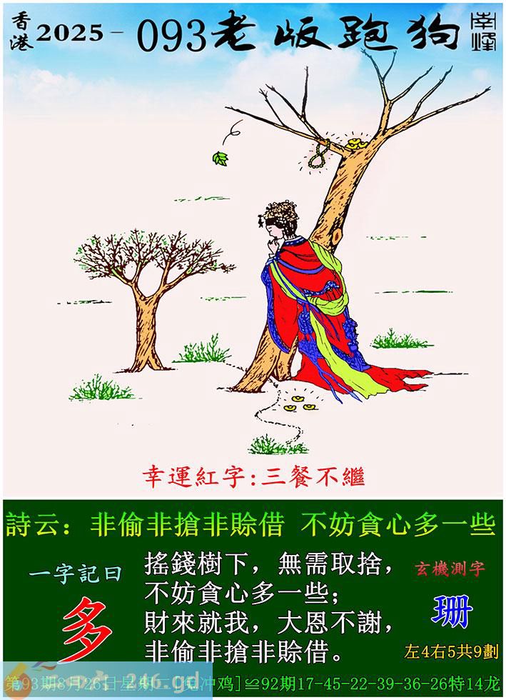 093期老版跑狗一字記之曰:【多】 詩雲:非偷非搶非賒借,不妨貪心多一些。
