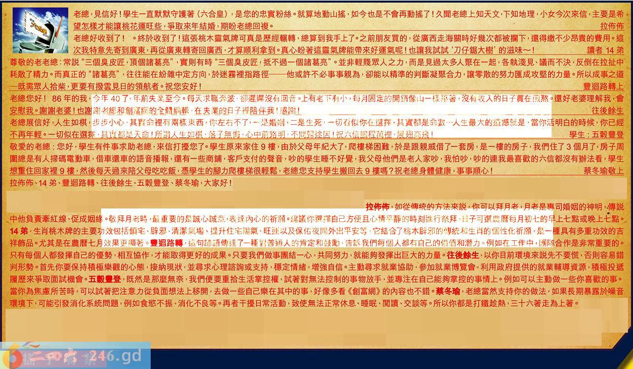 【1】.老總,見信好!學生一直默默守護著(六合皇),是您的忠實粉絲。就算地動山搖,如今也是不會再動搖了!久聞老總上知天文,下知地理,小女今次來信,主要是希望怎樣才能讓桃花運旺些,爭取來年結婚,期盼老總回複。拉布饰