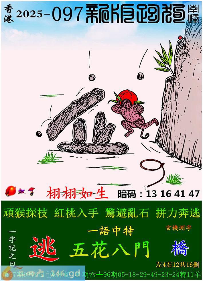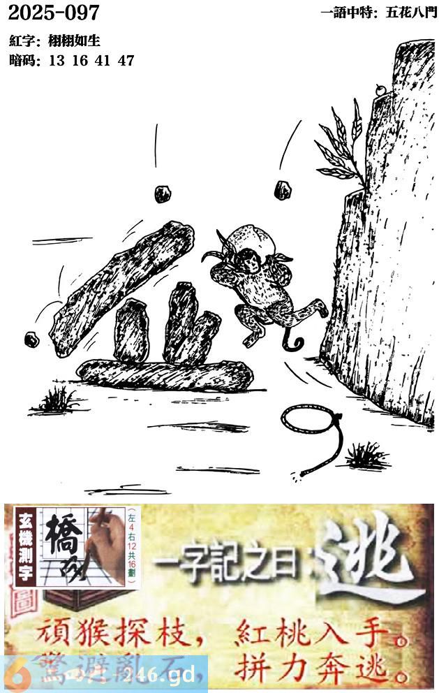 097期跑狗一字記之曰:【逃】 頑猴探枝,紅桃入手。 驚避亂石,拼力奔逃。