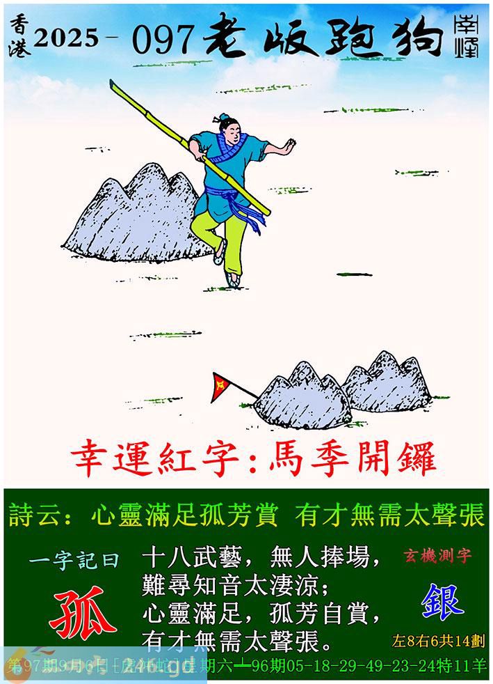 097期老版跑狗一字記之曰:【孤】 詩雲:心靈滿足孤芳賞,有才無需太聲張。