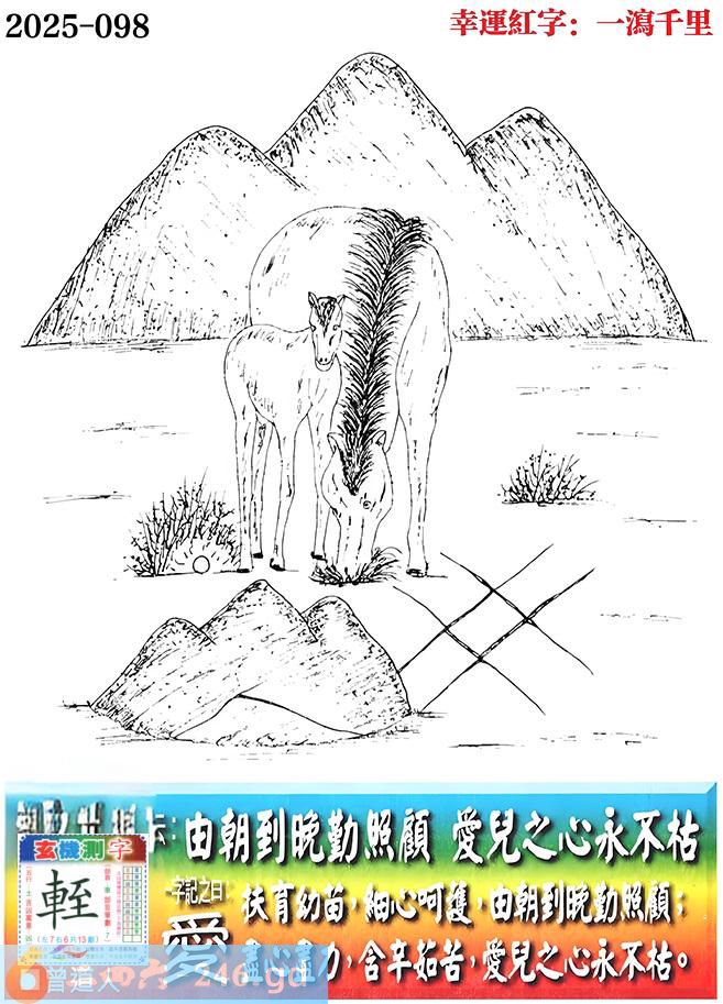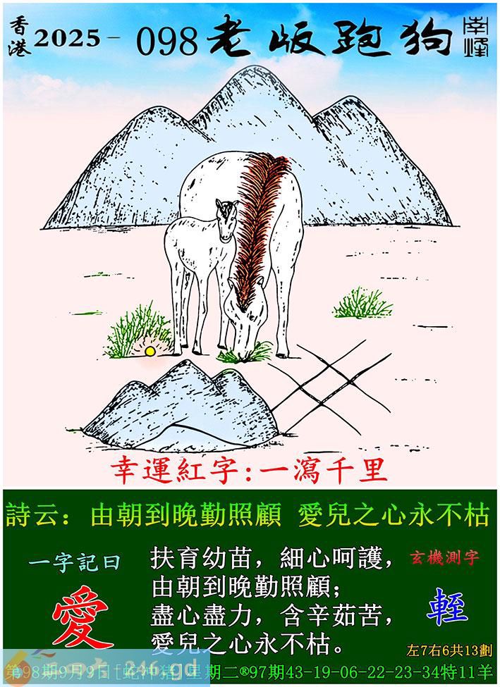 098期老版跑狗一字記之曰:【愛】 詩雲:由朝到晚勤照顧,愛兒之心永不枯。