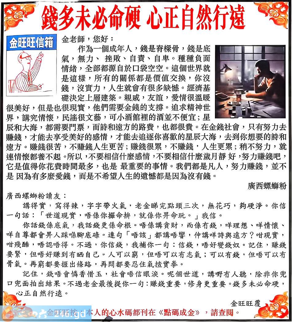 098期:金旺旺信箱彩民推荐→→《錢多未必命硬 心正自然行遠》