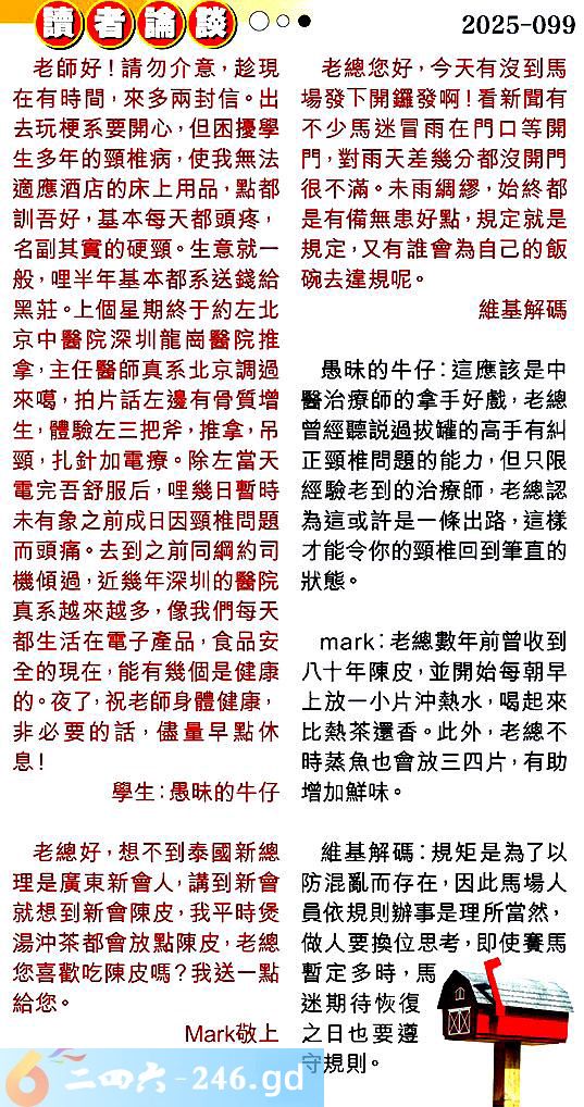 099期:彩民推荐〖貼信讀者論壇〗