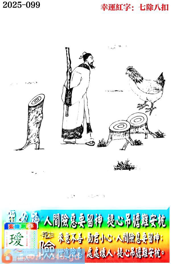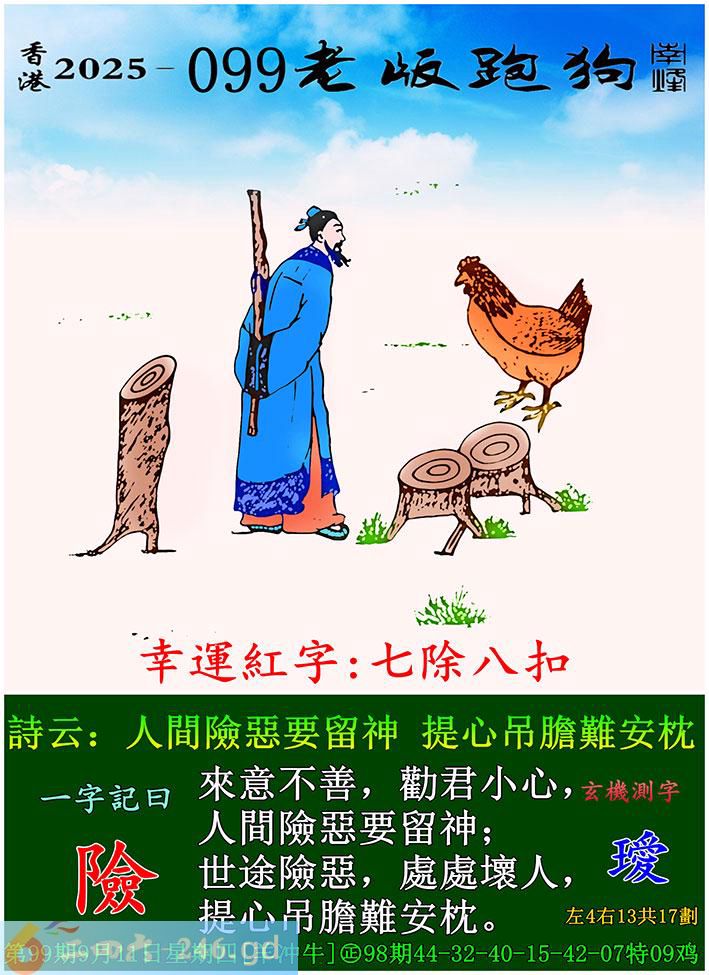 099期老版跑狗一字記之曰:【險】 詩雲:人間險惡要留神,提心吊膽難安枕。