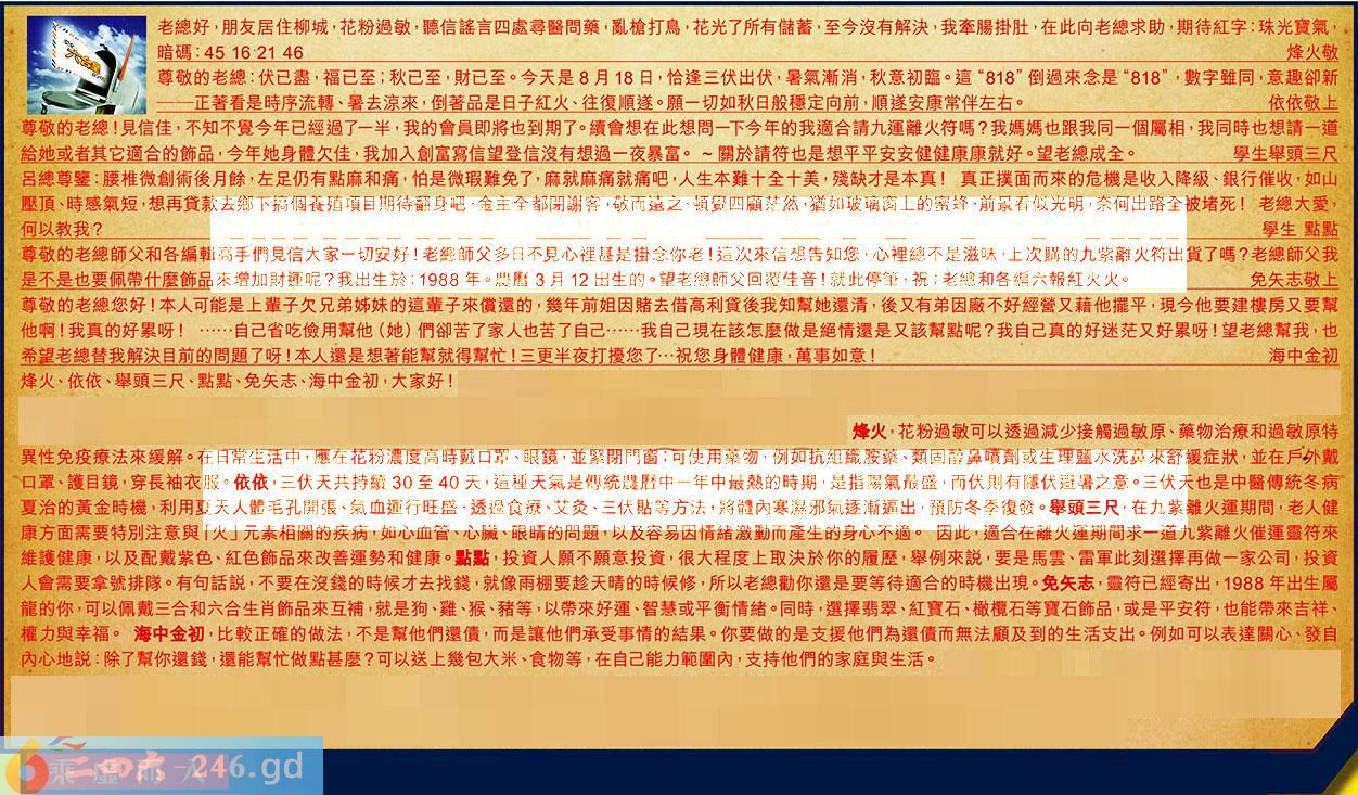 【1】.老總好,朋友居住柳城,花粉過敏,聽信謠言四處尋醫問藥,亂槍打鳥,花光了所有儲蓄,至今沒有解決,我牽腸掛肚,在此向老總求助,期待紅字:珠光寶氣,暗碼:45162146烽火敬