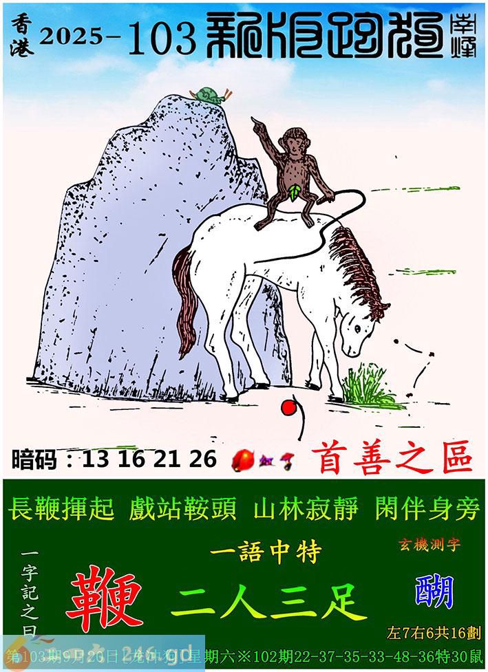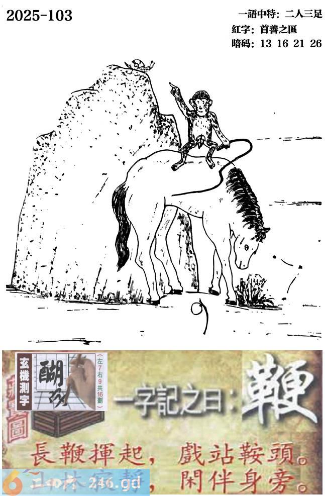103期跑狗一字記之曰:【鞭】 長鞭揮起,戲站鞍頭。 山林寂靜,閑伴身旁。